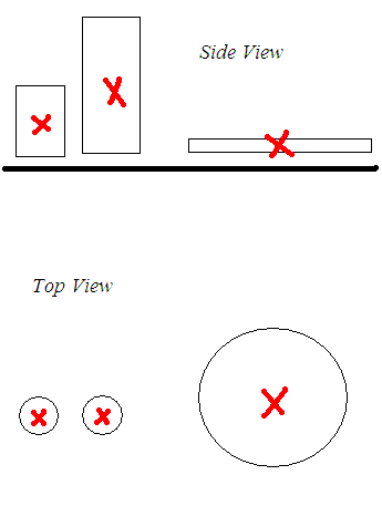 One other issue is that I need the center of mass marked from both a "side view" and a "top view" if you see what I mean. See drawing below...it shows 2 beakers and a dish. Center of masses are marked with Red crosses.