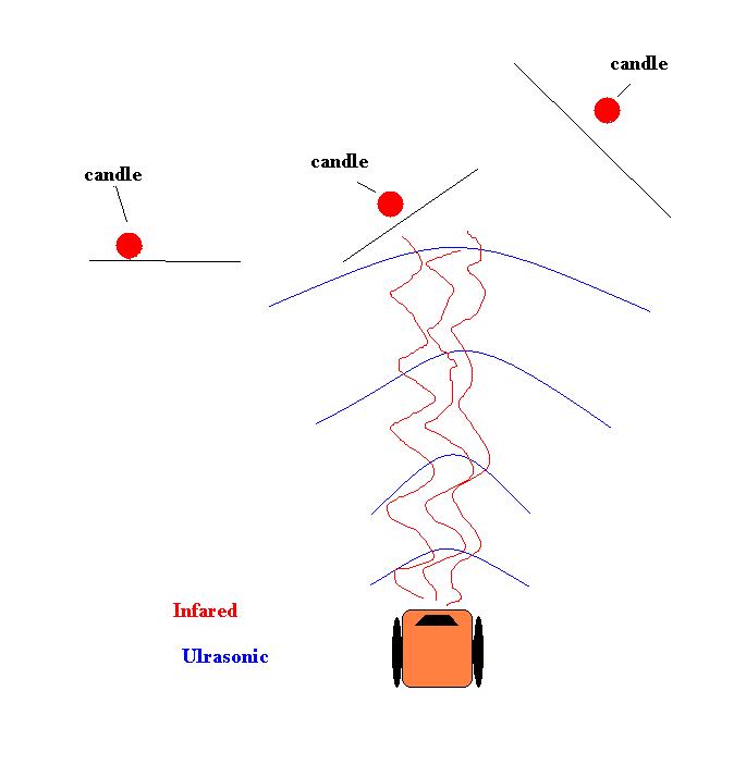 I am entering a fire fighting competition with a course similar to the picture shown below. The rules are that I have to navigate around the walls, blow out the candle without touching it, and do it under three minuets It may be simple but I can't figure out the final programming. I can get it to move and pick up the infrared signal, but I can't get it to move to the candle and blow it out. Can anyone help me?
