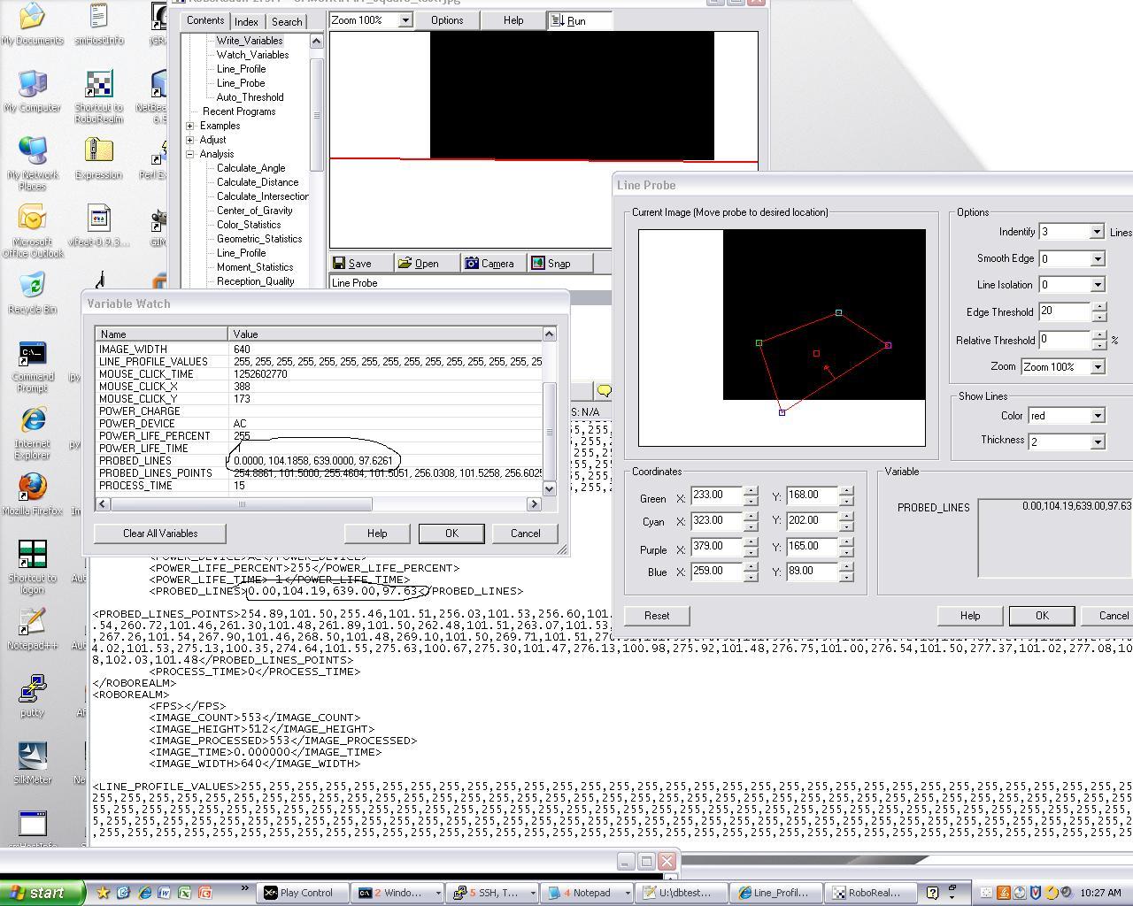 There seems to be rounding issues when trying to write or read variables. The included image and robo file have a Line_Probe example. In Watch_Variables you can see the values: 0.0000, 104.1858, 639.0000, and 97.6261. If the write the variables out or try to read them via the API you get: 0.00, 104.19, 639.00, and 97.63. It also happens the angles etc. I noticed that the time variable has 6 decimal places when saved. Maybe it is not the best example but it made my math fail when I tried to read the variables back and recreate the lines in Imagej (converting pixel distance to physical distance). Is there any way to set the number of decimal places (5 or 6 should work – if possible) when you save a variable or read it with an API call?