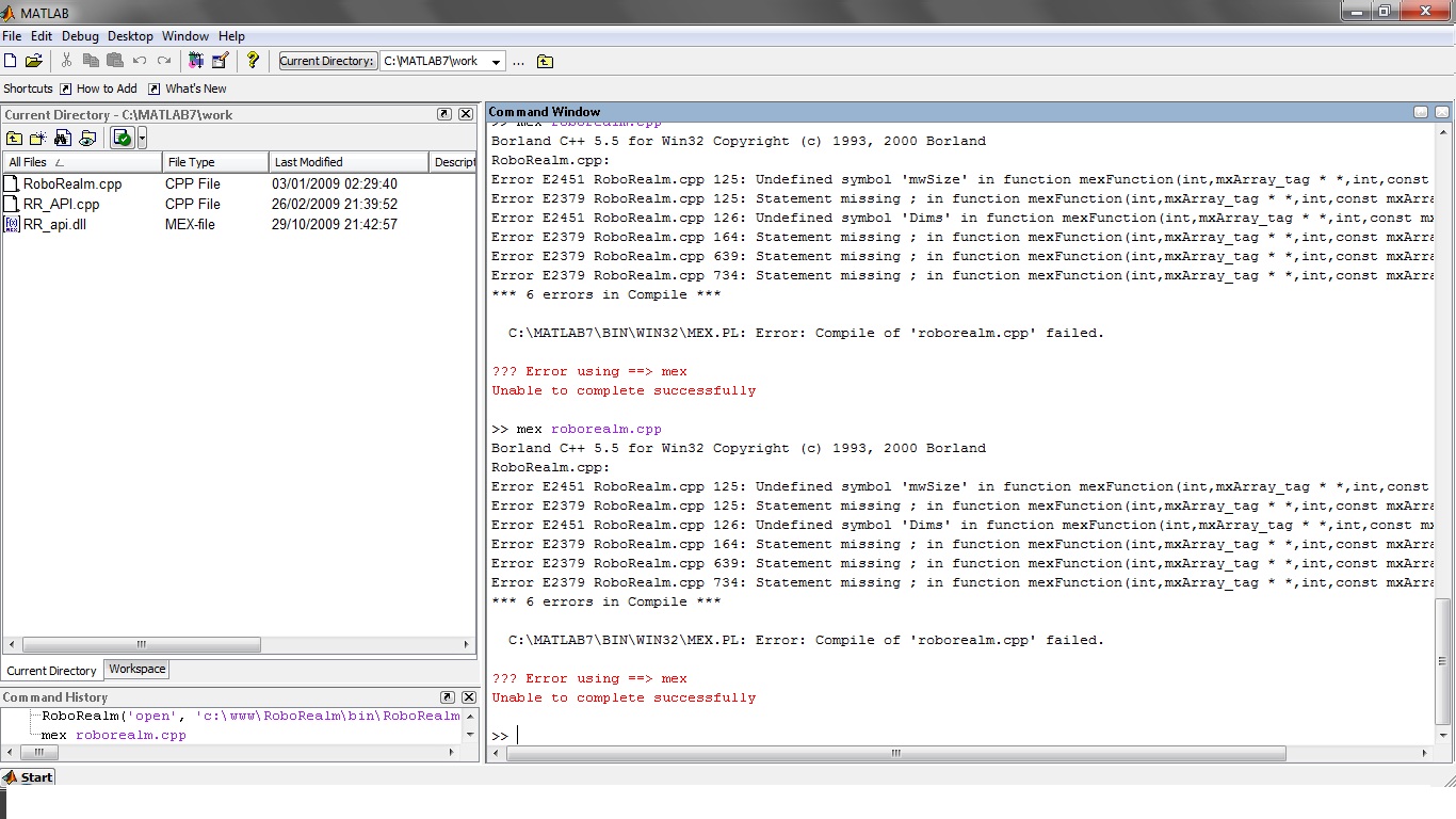 Error E2379 RoboRealm.cpp 164: Statement missing ; in function mexFunction(int,mxArray_tag * *,int,const mxArray_tag * *)