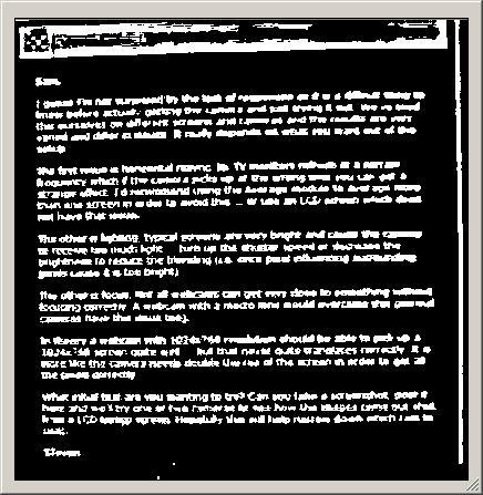 Attached is an example screen shot of a portion of this email as an example of the characters, objects and colors that must be seen clearly by a camera.