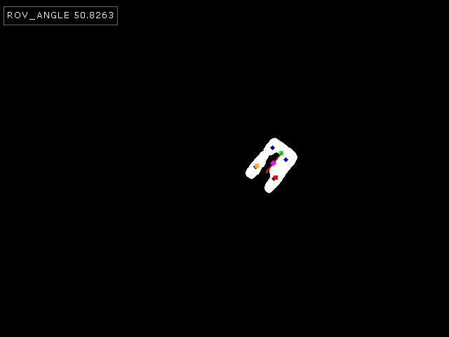 Attached is an image with a bunch of annotations so I can see what it's doing. The green point is the one calculated to be at the bottom of the "U", red and orange are the other two of the three cluster_points. The blue points are the four cluster_points. The purple diamond is the COG of the "U" blob and the red line is what is used to calculate angle, which is annotated in the top-left corner.