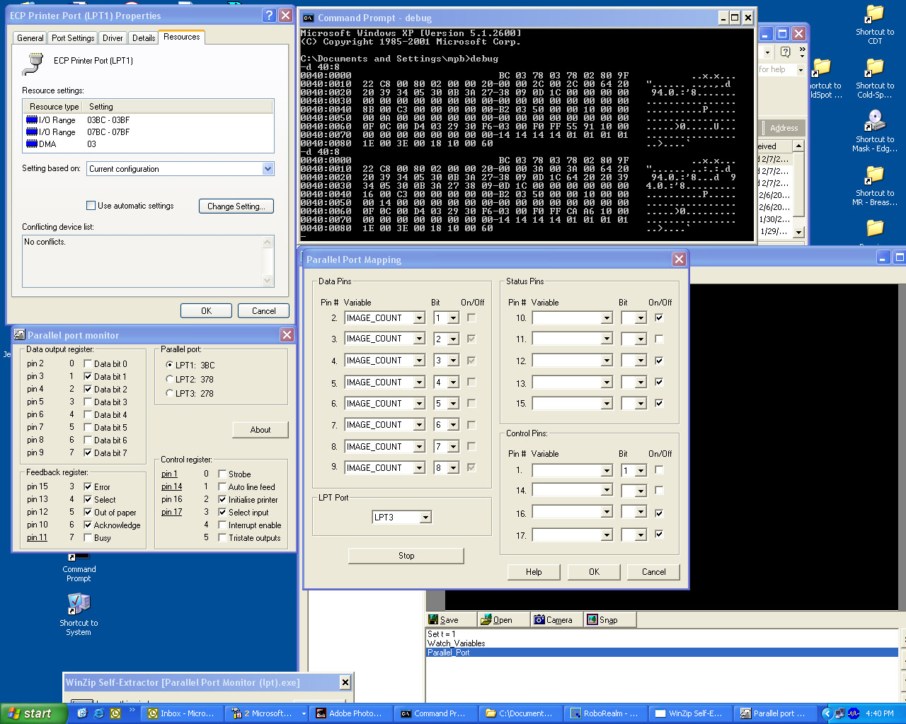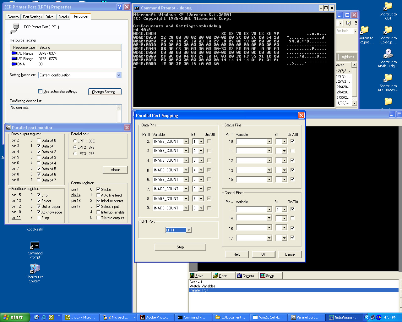 I have a question on what addresses the parallel port control uses. I have it working, but I'm not sure of the reason. It took some time to figure out what LPT setting to use in RoboRealm in relation to the resource setting in WinXP's control panel. I spent a bit of time with a multimeter waiting to get some life out of a chopped off printer cable before looking for a better way. There is a parallel port monitor in the screenshots which helped.