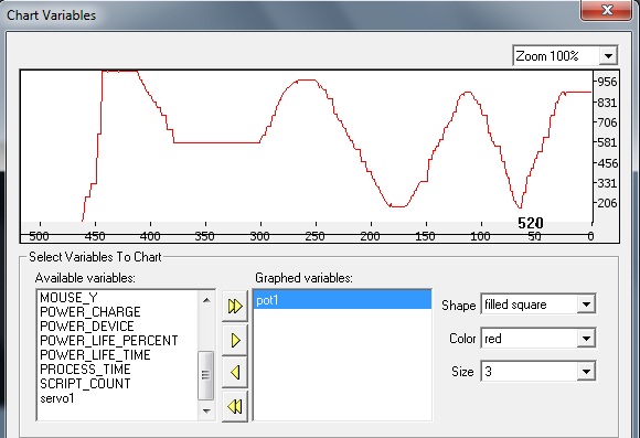 I've tried different servos, different boards (an SSC-32), different pots, and it always does it. Making me think I'm doing something wrong in Roborealm. But with only two basic modules left I'm not sure what it could be...