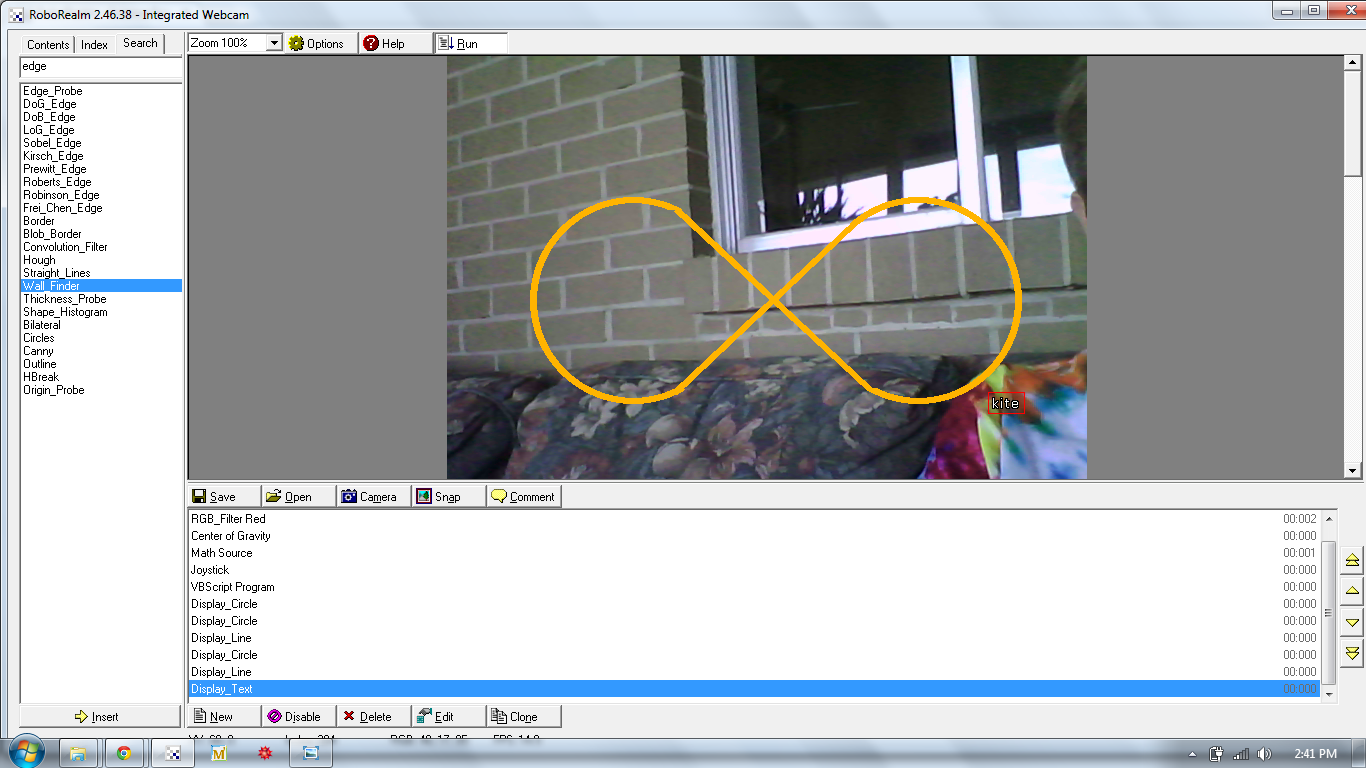 Hello! For my science fair project this year, I am trying to fly a kite robotically. I am using the Visual Basic plugin inside roborealm that then sends commands to a motor through the Phidgets motor controller. The kite is a kite-surfing kite. One of the lines is tied down, while the other line is wrapped around the spindle of the motor I am controlling. I was wondering if there is any way to draw a figure eight on roborealm and have the kite follow that pattern. I have tried using the optical flow function, but to no avail. All help is greatly appreciated!
