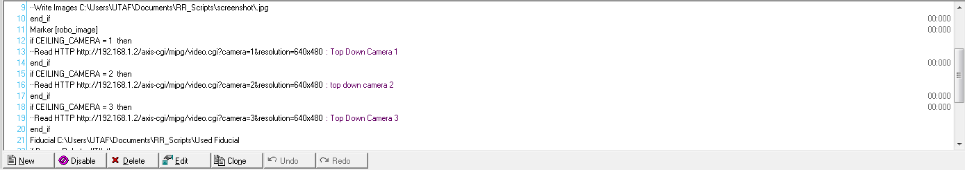 We have three "if test" modules that are used to determine which of three web cameras to display (see attached image). The idea is to only show the camera that the robot is in. The if test work fine and only the image from the camera with the robot displays video. However, we have noticed that the FPS drop when we switch to a different camera. It should be that the FPS stay the same since the "if test" modules only allow one camera at a time. To test that this is the issue we disabled all camera modules but one and noticed that the FPS increased. It appears that even when the if test module is false the read modules still grabs an image from the web camera. Any suggestions on how to correct this behavior or is it possible to disable a module from the vb script.