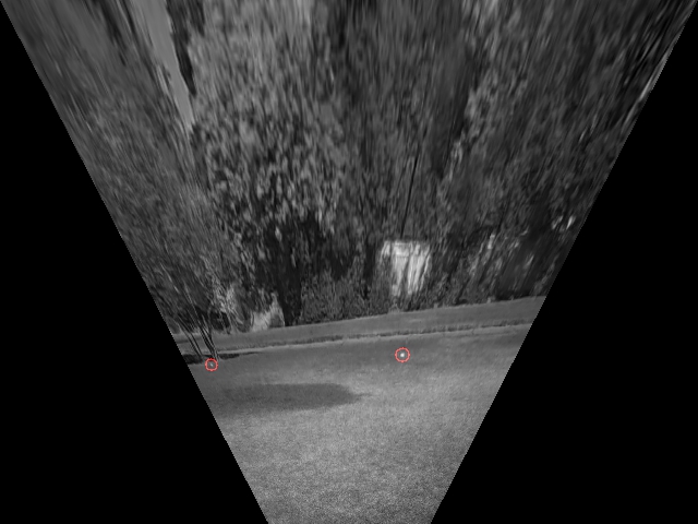 Second, we use the perspective module to warp the image in such a way as if viewed from above the scene. This has the huge advantage that objects far away and close will appear the same size. This is really helpful when trying to get a single solution that works when the objects are nearer. As we don't have anything to calibrate against you will have to get more images and tweak the value of that module to get it right for your camera. The easiest way to do this is to stand on a straight road and take a picture from the robot at the right angle (I'm assuming your camera angle to the ground is static) and then warp the image until the road appears straight in terms of width from the bottom to the top of the image. See