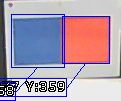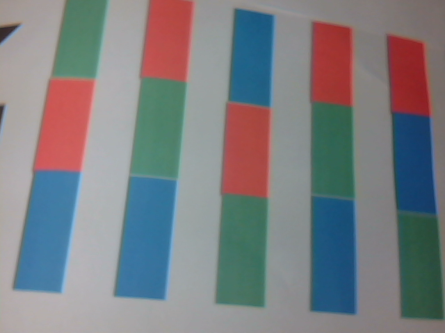 1. Have a look at how the attached robofile and image works to detect color barcodes of 3 colors. This is a more complicated problem that you have. In the case of this robofile we want to isolate the red/green/blue color strip ONLY (or blue/green/red). The trick here is to single out those green blocks touching red and blue strips. In your case you would pick one of the colors and see if another of similar size is very near to it.