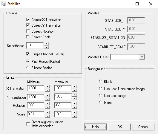 2. Variables - Select the smoothness (greater than 1.0) that is used to smooth the frame sequence. At 1.0 frames will be kept stable with no adjustment. Thus if the video sequence has global movement that leads the image to the extreme right the video stabilization will eventually cause the video to disappear. At high numbers 5.0+ the video sequence will update very abruptly and essentially invalidate any smoothing that would be performed. Thus if your video has many twists and turns a number above 1.1 should probably be used otherwise quick turns can cause a large amount of the stabilized video to be offscreen.