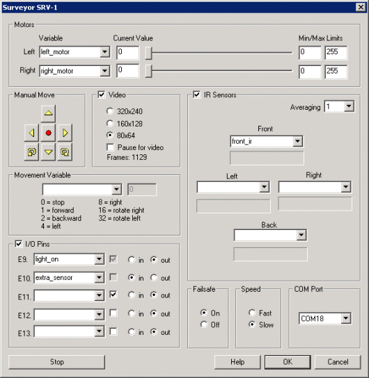 7. I/O Pins - to extend your Surveyor Robot you can use the IO Pins located on the robot to interface with other sensors or signal additional lights/LEDs/etc. To enable pin setting check the checkbox next to the I/O Pin group. The interface will then be enabled.