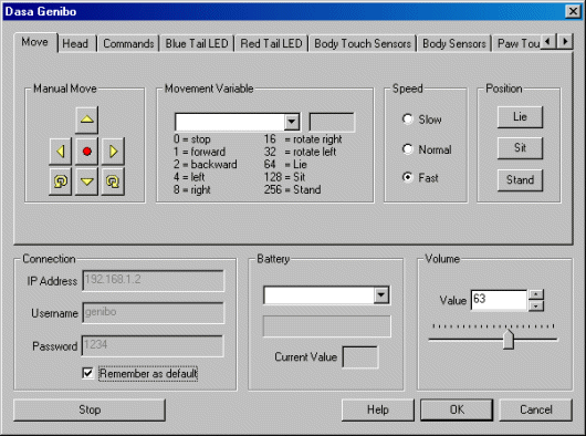 3. Press the Start button and if all the settings are correct you will hear "Control Manager connected" being spoken from the Genibo. Once disconnecting the Genibo will again make a similar announcement that the connection has been terminated. Keep in mind that if this ever happens during testing that the network connection has probably failed in some way. When this happens the robot immediately goes into its autonomous mode which can cause significant confusion as to why the robot is not acting as desired.