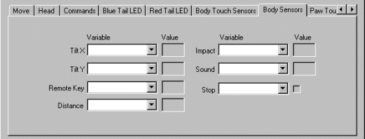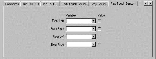 20. Paw Touch Sensors - On the bottom of each foot or paw there are microswitches that are triggered when the leg touches a hard surface. The Paw tab will indicate the state of these sensors. When the switch is triggered the checkbox will indicate a set state (1) whereas when the foot is not touching the value will be unset (0). You can use these sensors to tell if the foot is touching the floor. Note, however, that thick carpet does not provide enough resistance to trigger these switches so care should be taken when relying on these sensors. To use these sensor values in other modules select or type in a variable that will contain the switches state.