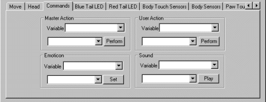 10. Master Action (Commands Tab) - the third and final way to move the robot is to perform a particular Master Action file. The Master Action files are those movements that come pre-installed in the Genibo. Selecting a particular movement and press the perform button will cause the robot to act out that movement. This includes the basic movements of moving forward, left, right, etc. To automatically specify an action select a variable that will contain the name (i.e. Walk-walk step 1) which action to perform. Note that this variable's value is cleared after being used once.