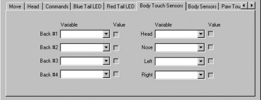 16. Body Touch Sensors - The Value checkboxes will reflect the state of the particular sensor. Back #1 - 4 indicate the state of the back sensors. Pressing one of the back sensors will cause the appropriate checkbox to become set. The Head sensor is between the robot's ears with the Left and Right sensors being on the left and right sides of the robot (essentially where you would grasp the robot to pick it up). If you want to use or send these sensor values select or type in a variable that will be used to contain the current state of the appropriate sensor. This variable can then be used in other modules to indicate or change the robot's state.
